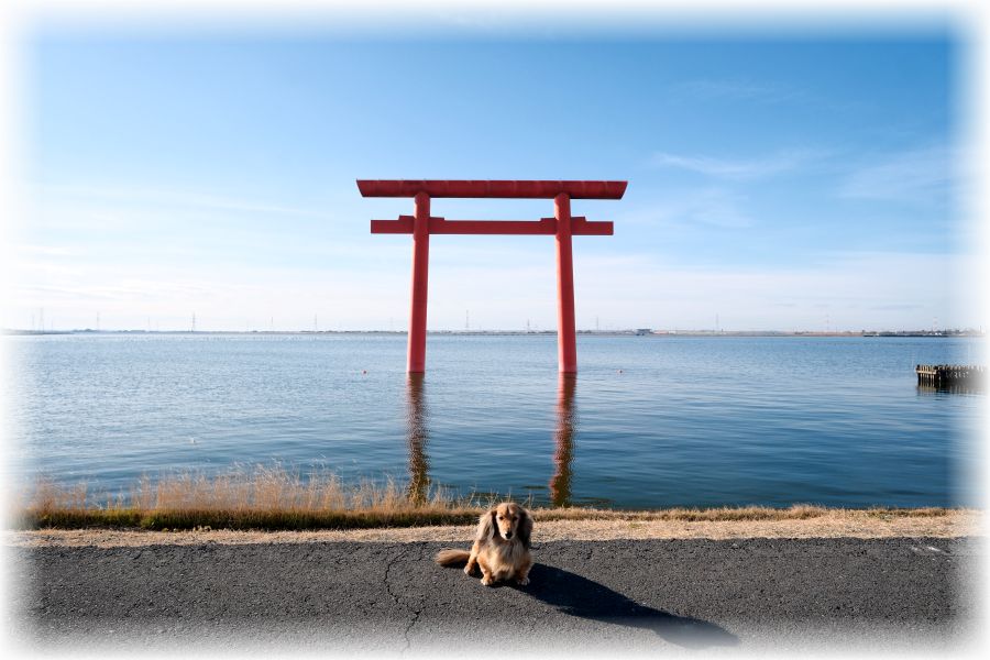 水辺まで足を伸ばしてみると、早朝で静かでありながら時々そよ風に揺れる北浦の水面と独特の空気が印象的でした。人間にとって鳥居の内外の区別は明確でも、犬や神様の視点ではきっと一続きの世界なのかもしれません。来訪時のドギーはとても静かな良い子でした。